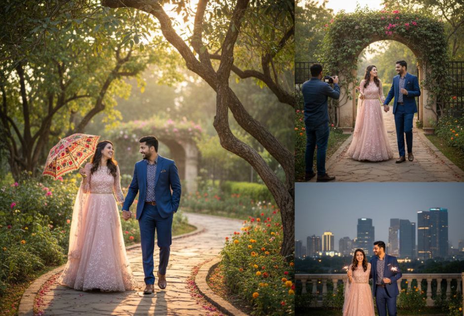 Noida offers stunning pre-wedding photoshoot spots—lush parks, modern architecture, cafés, resorts, and heritage locations in nearby Delhi/NCR.